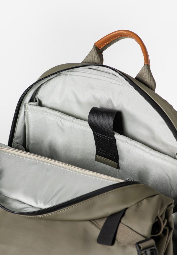 a/u by aunts & uncles – KITAKAMI RE Kitakami RE ist aus recyceltem Nylon gefertigt, das regenfest, leicht und dabei unheimlich robust ist. Der zweigeteilte Rucksack verfügt über ein größenverstellbares Hauptfach mit praktischem Rolltopverschluss sowie über ein weiteres Hauptfach mit umlaufendem Reißverschluss. Verschiedene Einsteckfächer, ein gepolstertes Fach für ein Notebook, Stiftschlaufen, ein herausnehmbares Extra-Täschchen und ein Schlüsselband sorgen im Inneren für Ordnung und Übersicht. Die gekreuzten Riemen aus nachhaltig gegerbtem Premium-Leder verleihen dem geräumigen Businessrucksack einen unverwechselbaren Look. Vorder- und rückseitig angebrachte Steckschlösser erlauben eine flexible Befestigung des Rolltops. Ein ergonomisch geformtes Rückenpolster sorgt für angenehmen Tragekomfort.