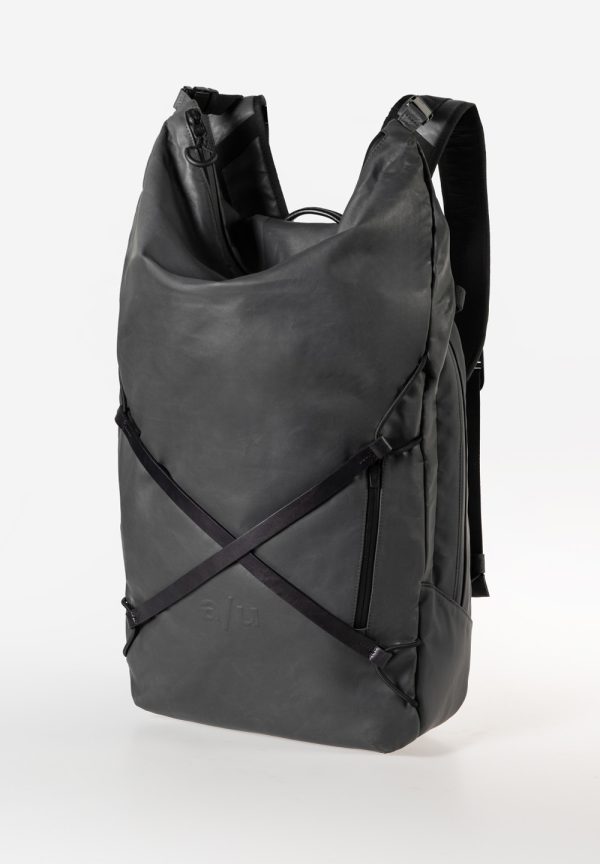 a/u by aunts & uncles – KITAKAMI RE Kitakami RE ist aus recyceltem Nylon gefertigt, das regenfest, leicht und dabei unheimlich robust ist. Der zweigeteilte Rucksack verfügt über ein größenverstellbares Hauptfach mit praktischem Rolltopverschluss sowie über ein weiteres Hauptfach mit umlaufendem Reißverschluss. Verschiedene Einsteckfächer, ein gepolstertes Fach für ein Notebook, Stiftschlaufen, ein herausnehmbares Extra-Täschchen und ein Schlüsselband sorgen im Inneren für Ordnung und Übersicht. Die gekreuzten Riemen aus nachhaltig gegerbtem Premium-Leder verleihen dem geräumigen Businessrucksack einen unverwechselbaren Look. Vorder- und rückseitig angebrachte Steckschlösser erlauben eine flexible Befestigung des Rolltops. Ein ergonomisch geformtes Rückenpolster sorgt für angenehmen Tragekomfort.
