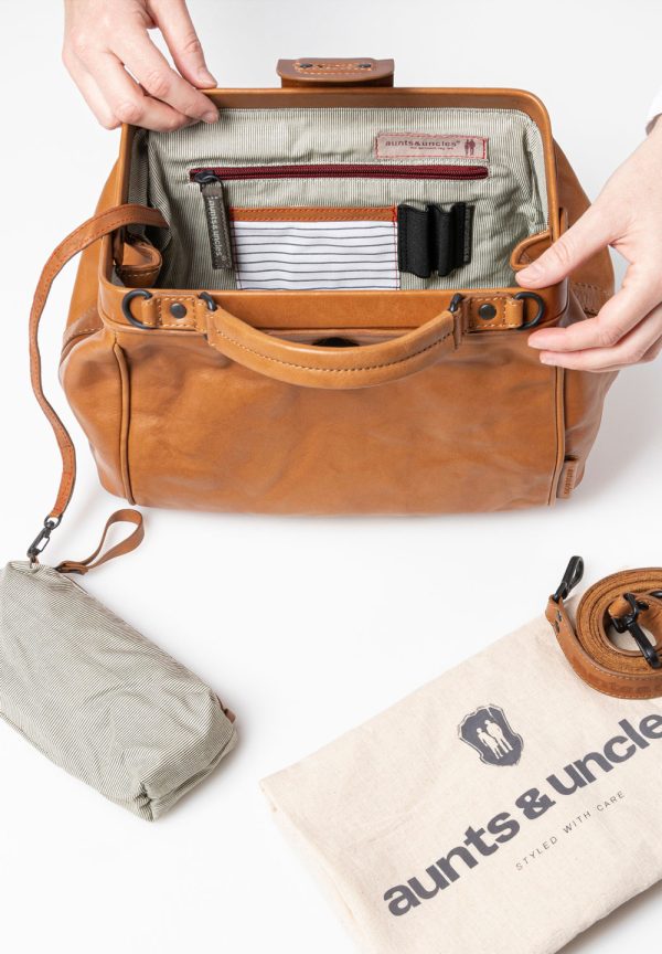 aunts & uncles – MRS. CUSTARD PIE Oh lala! Mrs. Custard Pie verzaubert mit ihrer Baguette-Form, einer großen Bügelöffnung und einem dezenten Drehschloss. Der kurze Henkel verleiht ihr den Look einer adretten Handtasche. Dank des abnehmbaren langen Gurtes lässt sich Mrs. Custard Pie aber auch lässig crossbody oder über der Schulter tragen. Ein strukturiertes Innenleben und ein schlichter, gestreifter Futterstoff runden das nostalgische Gesamtbild von Mrs. Custard Pie ab und machen sie zu einer charmanten Alltagsbegleiterin aus hochwertigem Premium-Leder.