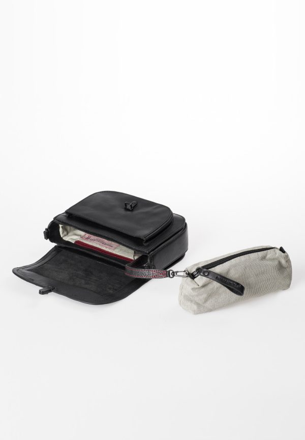 - großes, unterteiltes Hauptfach mit Überschlag und Steckschloss